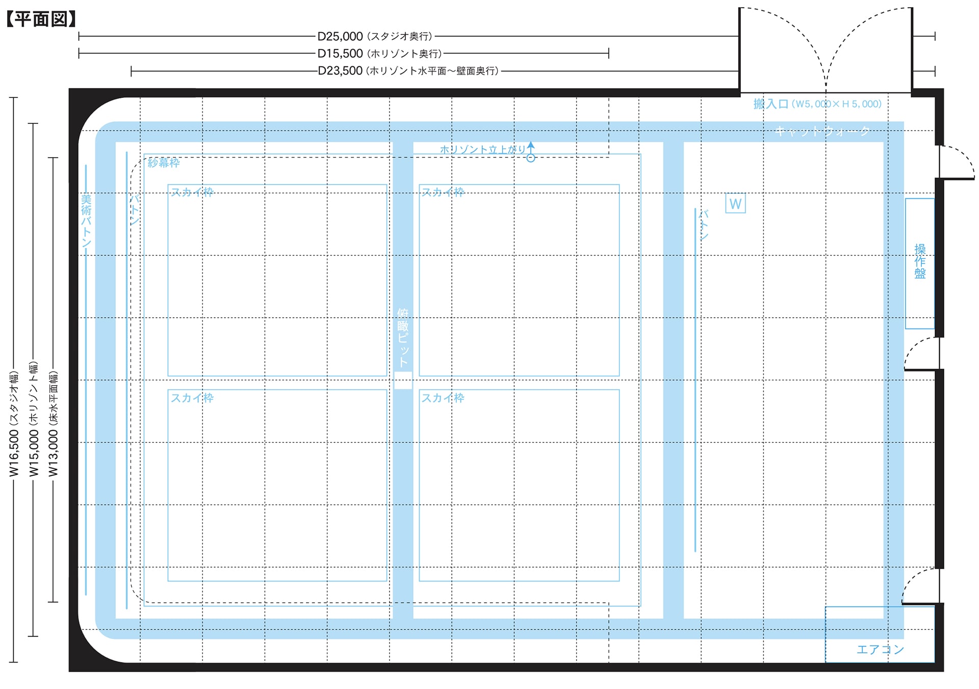 120坪の広さと天井高7.5mを誇る、当施設最大のスタジオです。3面Rホリゾントに加え、俯瞰ピット付きキャットウォークを完備し、真俯瞰撮影や大型セットの組み込みにも柔軟に対応。 5m四方の開放的な搬入口により、大型車両や重量のある美術セットの出し入れも極めてスムーズに行える、表現の自由度が高い空間です。